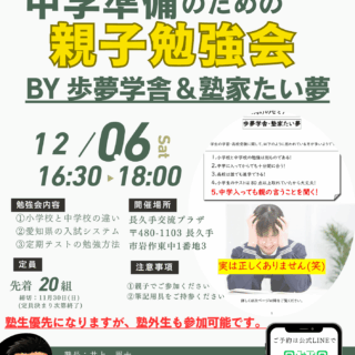 毎年恒例の、中学準備勉強会を開催いたします! 12月6日(土) 16時30分から18時まで 長久手交...